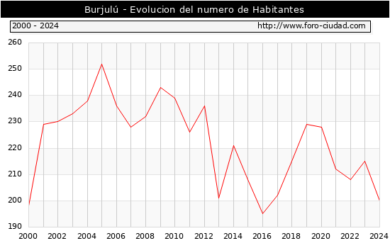 el numero de habitantes en Burjulú era de 200, 15 habitantes menos que el en el año 2023. En el grafico siguiente se puede ver cuantos habitantes tiene Burjulú a lo largo de los años.