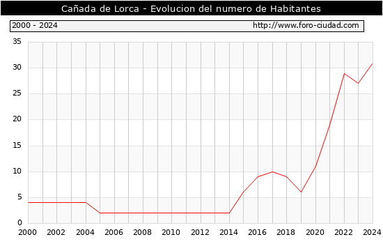 el numero de habitantes en Cañada de Lorca era de 31, 4 habitantes mas que el en el año 2023. En el grafico siguiente se puede ver cuantos habitantes tiene Cañada de Lorca a lo largo de los años.