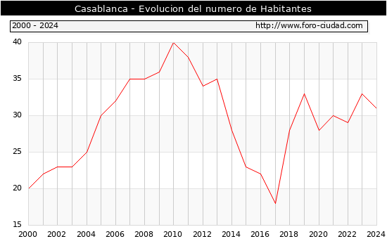 el numero de habitantes en Casablanca era de 31, 2 habitantes menos que el en el año 2023. En el grafico siguiente se puede ver cuantos habitantes tiene Casablanca a lo largo de los años.