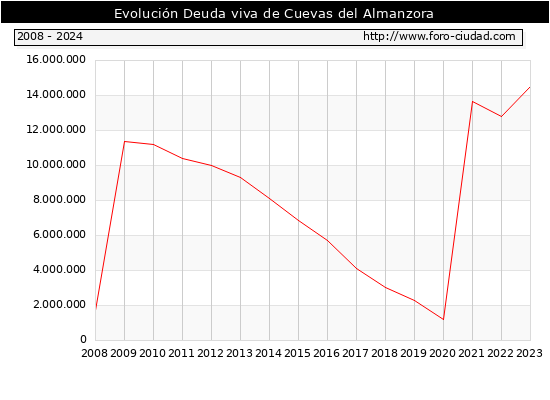 Cuevas del Almanzora - Deuda viva del Ayuntamiento a 31/12/2024 Cuevas del Almanzora - Deuda viva del Ayuntamiento a 31/12/2024 Segun el Ministerio de Economia y Hacienda el Ayuntamiento de Cuevas del Almanzora a 31/12/2024 posee una deuda de 17.687.000 € . La deuda viva a 31/12/2023 ascendia a 14.508.000 € por lo que en el ultimo año la deuda crecio en 3.179.000 €. ![]()