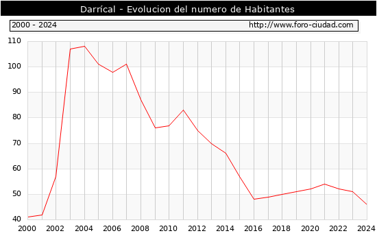 el numero de habitantes en Darrícal era de 46, 5 habitantes menos que el en el año 2023. En el grafico siguiente se puede ver cuantos habitantes tiene Darrícal a lo largo de los años.