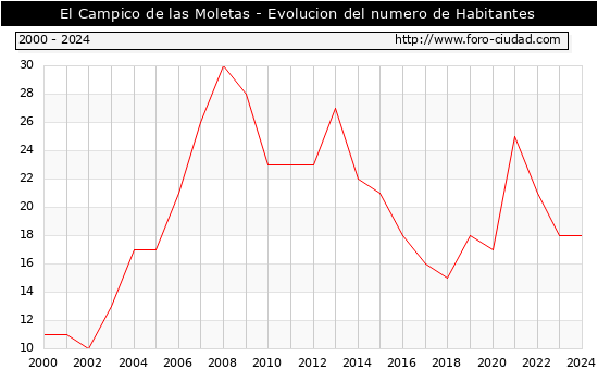 el numero de habitantes en El Campico de las Moletas era de 18, igual numero de habitantes que el en el año 2023. En el grafico siguiente se puede ver cuantos habitantes tiene El Campico de las Moletas a lo largo de los años.
