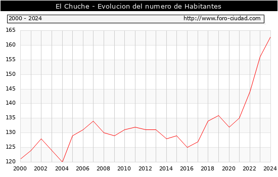 el numero de habitantes en El Chuche era de 163, 7 habitantes mas que el en el año 2023. En el grafico siguiente se puede ver cuantos habitantes tiene El Chuche a lo largo de los años.
