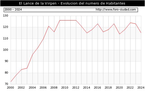 el numero de habitantes en El Lance de la Virgen era de 115, 8 habitantes menos que el en el año 2023. En el grafico siguiente se puede ver cuantos habitantes tiene El Lance de la Virgen a lo largo de los años.