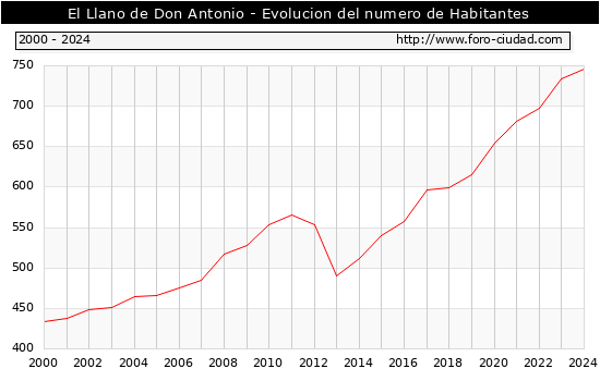 el numero de habitantes en El Llano de Don Antonio era de 746, 12 habitantes mas que el en el año 2023. En el grafico siguiente se puede ver cuantos habitantes tiene El Llano de Don Antonio a lo largo de los años.