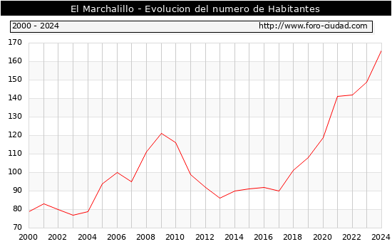 el numero de habitantes en El Marchalillo era de 166, 17 habitantes mas que el en el año 2023. En el grafico siguiente se puede ver cuantos habitantes tiene El Marchalillo a lo largo de los años.
