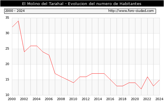 el numero de habitantes en El Molino del Tarahal era de 15, 2 habitantes mas que el en el año 2023. En el grafico siguiente se puede ver cuantos habitantes tiene El Molino del Tarahal a lo largo de los años.