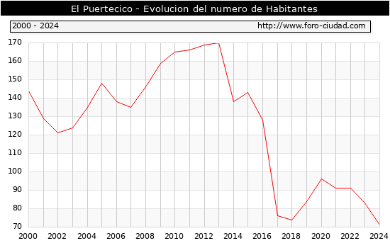 el numero de habitantes en El Puertecico era de 71, 12 habitantes menos que el en el año 2023. En el grafico siguiente se puede ver cuantos habitantes tiene El Puertecico a lo largo de los años.