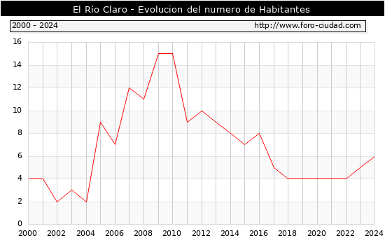 el numero de habitantes en El Río Claro era de 6, 1 habitantes mas que el en el año 2023. En el grafico siguiente se puede ver cuantos habitantes tiene El Río Claro a lo largo de los años.