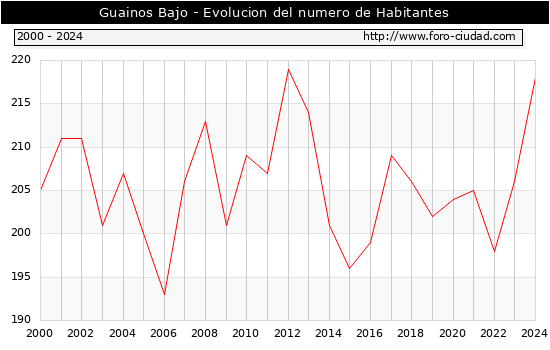 el numero de habitantes en Guainos Bajo era de 218, 12 habitantes mas que el en el año 2023. En el grafico siguiente se puede ver cuantos habitantes tiene Guainos Bajo a lo largo de los años.