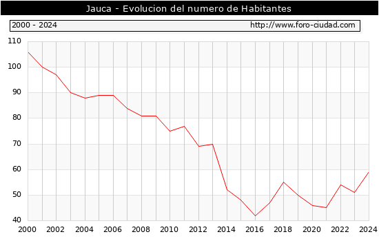 el numero de habitantes en Jauca era de 59, 8 habitantes mas que el en el año 2023. En el grafico siguiente se puede ver cuantos habitantes tiene Jauca a lo largo de los años.