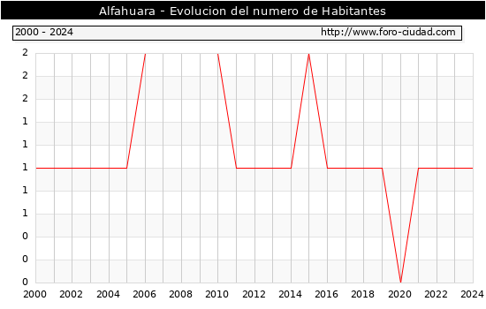 Segun los datos publicados por el INE a 1 de Enero de 2024 el numero de habitantes en Alfahuara era de 1, igual numero de habitantes que el en el año 2023. En el grafico siguiente se puede ver cuantos habitantes tiene Alfahuara a lo largo de los años.