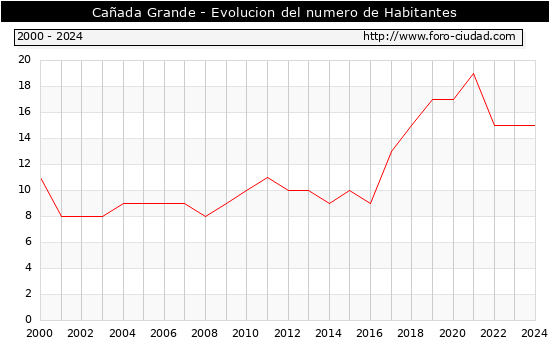 el numero de habitantes en Cañada Grande era de 15, igual numero de habitantes que el en el año 2023. En el grafico siguiente se puede ver cuantos habitantes tiene Cañada Grande a lo largo de los años.