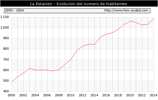 el numero de habitantes en La Estación era de 1.086, 51 habitantes mas que el en el año 2023. En el grafico siguiente se puede ver cuantos habitantes tiene La Estación a lo largo de los años.