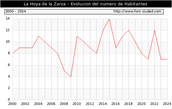 Segun los datos publicados por el INE a 1 de Enero de 2024 el numero de habitantes en La Hoya de la Zarza era de 7, igual numero de habitantes que el en el año 2023. En el grafico siguiente se puede ver cuantos habitantes tiene La Hoya de la Zarza a lo largo de los años.