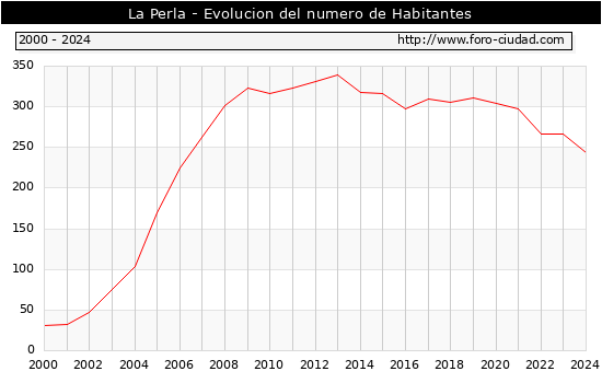 el numero de habitantes en La Perla era de 243, 23 habitantes menos que el en el año 2023. En el grafico siguiente se puede ver cuantos habitantes tiene La Perla a lo largo de los años.