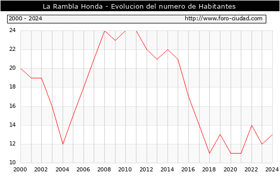el numero de habitantes en La Rambla Honda era de 13, 1 habitantes mas que el en el año 2023. En el grafico siguiente se puede ver cuantos habitantes tiene La Rambla Honda a lo largo de los años.