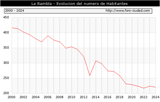 el numero de habitantes en La Rambla era de 220, 4 habitantes menos que el en el año 2023. En el grafico siguiente se puede ver cuantos habitantes tiene La Rambla a lo largo de los años.