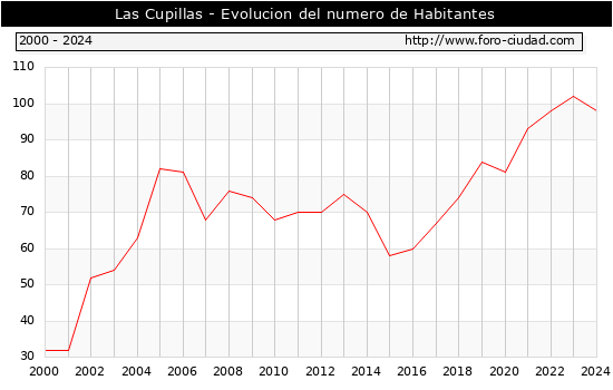 el numero de habitantes en Las Cupillas era de 98, 4 habitantes menos que el en el año 2023. En el grafico siguiente se puede ver cuantos habitantes tiene Las Cupillas a lo largo de los años.