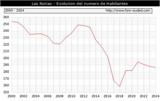 el numero de habitantes en Las Norias era de 187, 1 habitantes menos que el en el año 2023. En el grafico siguiente se puede ver cuantos habitantes tiene Las Norias a lo largo de los años.