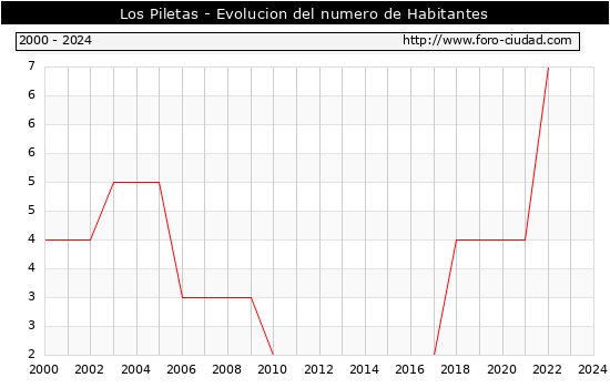 el numero de habitantes en Los Piletas era de 7, igual numero de habitantes que el en el año 2023. En el grafico siguiente se puede ver cuantos habitantes tiene Los Piletas a lo largo de los años.