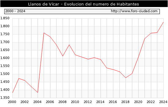 el numero de habitantes en Llanos de Vícar era de 1.828, 66 habitantes mas que el en el año 2023. En el grafico siguiente se puede ver cuantos habitantes tiene Llanos de Vícar a lo largo de los años.