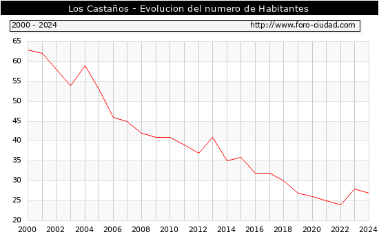 el numero de habitantes en Los Castaños era de 27, 1 habitantes menos que el en el año 2023. En el grafico siguiente se puede ver cuantos habitantes tiene Los Castaños a lo largo de los años.