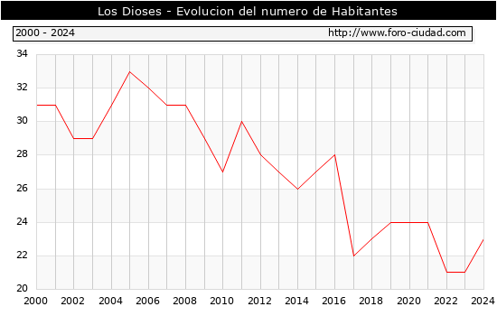 el numero de habitantes en Los Dioses era de 23, 2 habitantes mas que el en el año 2023. En el grafico siguiente se puede ver cuantos habitantes tiene Los Dioses a lo largo de los años.