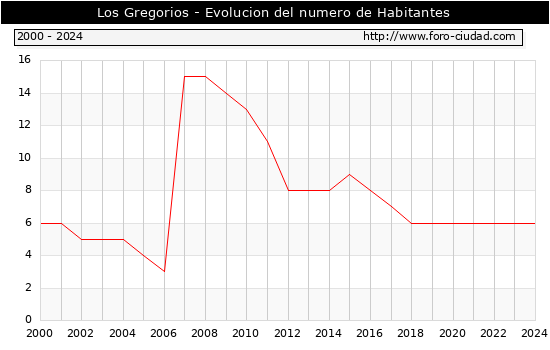 el numero de habitantes en Los Gregorios era de 6, igual numero de habitantes que el en el año 2023. En el grafico siguiente se puede ver cuantos habitantes tiene Los Gregorios a lo largo de los años.