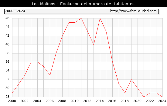 el numero de habitantes en Los Malinos era de 28, 1 habitantes menos que el en el año 2023. En el grafico siguiente se puede ver cuantos habitantes tiene Los Malinos a lo largo de los años.