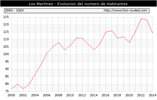 el numero de habitantes en Los Martínez era de 114, 9 habitantes menos que el en el año 2023. En el grafico siguiente se puede ver cuantos habitantes tiene Los Martínez a lo largo de los años.