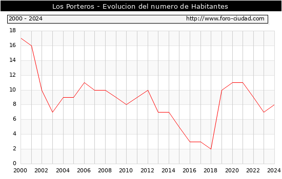 el numero de habitantes en Los Porteros era de 8, 1 habitantes mas que el en el año 2023. En el grafico siguiente se puede ver cuantos habitantes tiene Los Porteros a lo largo de los años.