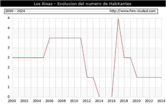 el numero de habitantes en Los Risas era de 1, igual numero de habitantes que el en el año 2023. En el grafico siguiente se puede ver cuantos habitantes tiene Los Risas a lo largo de los años.