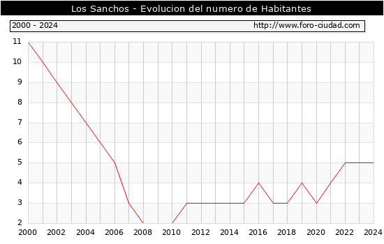 el numero de habitantes en Los Sanchos era de 5, igual numero de habitantes que el en el año 2023. En el grafico siguiente se puede ver cuantos habitantes tiene Los Sanchos a lo largo de los años.