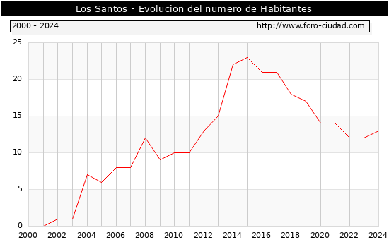 el numero de habitantes en Los Santos era de 13, 1 habitantes mas que el en el año 2023. En el grafico siguiente se puede ver cuantos habitantes tiene Los Santos a lo largo de los años.