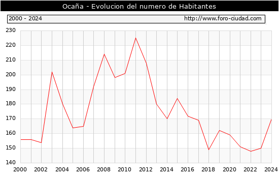 el numero de habitantes en Ocaña era de 170, 20 habitantes mas que el en el año 2023. En el grafico siguiente se puede ver cuantos habitantes tiene Ocaña a lo largo de los años.