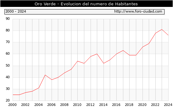 el numero de habitantes en Oro Verde era de 76, 5 habitantes menos que el en el año 2023. En el grafico siguiente se puede ver cuantos habitantes tiene Oro Verde a lo largo de los años.