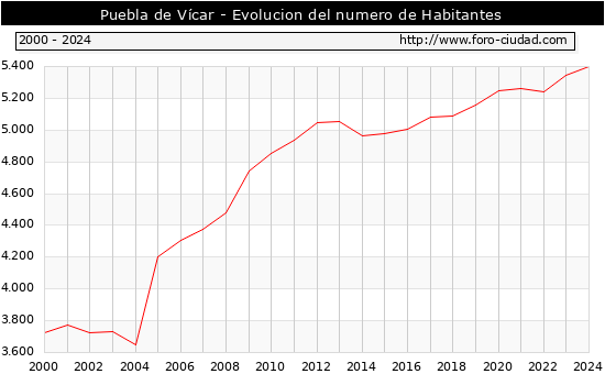 el numero de habitantes en Puebla de Vícar era de 5.399, 55 habitantes mas que el en el año 2023. En el grafico siguiente se puede ver cuantos habitantes tiene Puebla de Vícar a lo largo de los años.