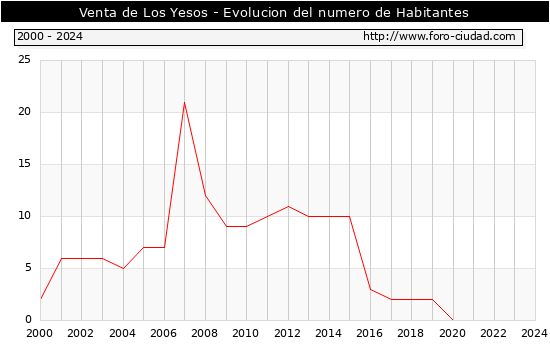 el numero de habitantes en Venta de Los Yesos era de 0, igual numero de habitantes que el en el año 2023. En el grafico siguiente se puede ver cuantos habitantes tiene Venta de Los Yesos a lo largo de los años.