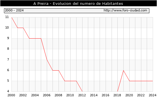 el numero de habitantes en A Preira era de 5, igual numero de habitantes que el en el año 2023. En el grafico siguiente se puede ver cuantos habitantes tiene A Preira a lo largo de los años.