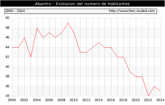 el numero de habitantes en Abantru era de 35, 1 habitantes menos que el en el año 2023. En el grafico siguiente se puede ver cuantos habitantes tiene Abantru a lo largo de los años.