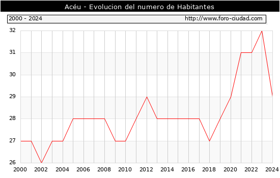 el numero de habitantes en Acéu era de 29, 3 habitantes menos que el en el año 2023. En el grafico siguiente se puede ver cuantos habitantes tiene Acéu a lo largo de los años.