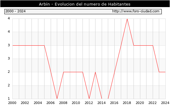 el numero de habitantes en Arbín era de 2, igual numero de habitantes que el en el año 2023. En el grafico siguiente se puede ver cuantos habitantes tiene Arbín a lo largo de los años.