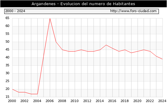 el numero de habitantes en Argandenes era de 39, 2 habitantes menos que el en el año 2023. En el grafico siguiente se puede ver cuantos habitantes tiene Argandenes a lo largo de los años.