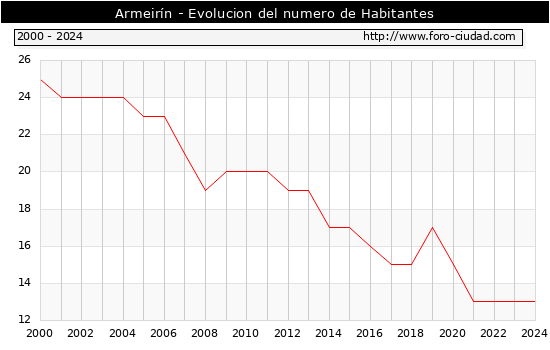 el numero de habitantes en Armeirín era de 13, igual numero de habitantes que el en el año 2023. En el grafico siguiente se puede ver cuantos habitantes tiene Armeirín a lo largo de los años.