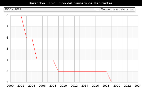 el numero de habitantes en Barandon era de 2, igual numero de habitantes que el en el año 2023. En el grafico siguiente se puede ver cuantos habitantes tiene Barandon a lo largo de los años.