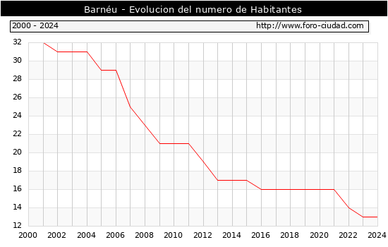 el numero de habitantes en Barnéu era de 13, igual numero de habitantes que el en el año 2023. En el grafico siguiente se puede ver cuantos habitantes tiene Barnéu a lo largo de los años.