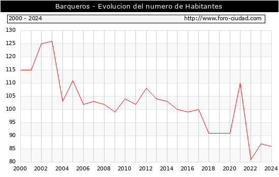 el numero de habitantes en Barqueros era de 86, 1 habitantes menos que el en el año 2023. En el grafico siguiente se puede ver cuantos habitantes tiene Barqueros a lo largo de los años.