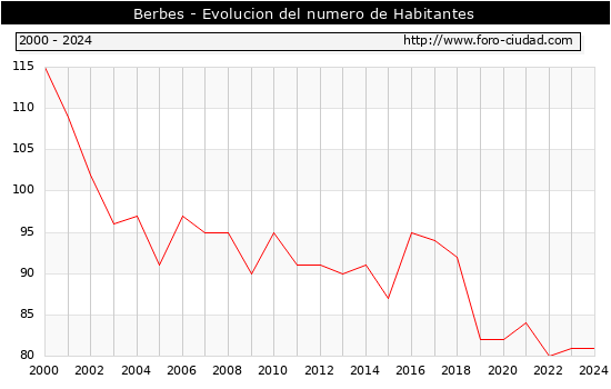 el numero de habitantes en Berbes era de 81, igual numero de habitantes que el en el año 2023. En el grafico siguiente se puede ver cuantos habitantes tiene Berbes a lo largo de los años.