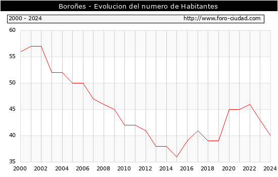 el numero de habitantes en Boroñes era de 40, 3 habitantes menos que el en el año 2023. En el grafico siguiente se puede ver cuantos habitantes tiene Boroñes a lo largo de los años.